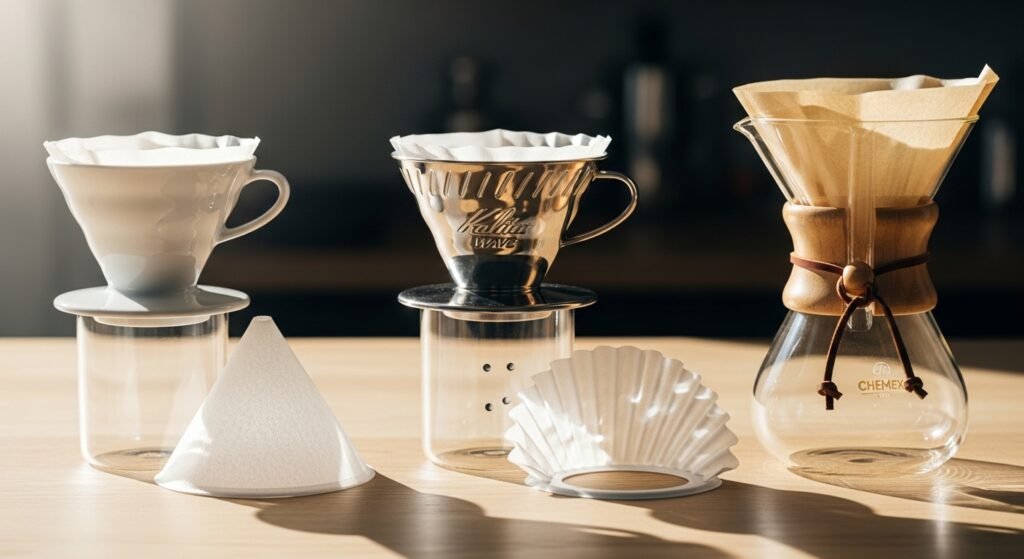 Wavy Filters: The ridges in a Kalita-style filter aren’t just for show. They create an air gap between the paper and the wall of the dripper. This prevents the “suction effect,” where the paper sticks to the glass and stalls the flow of water. By keeping the air moving, the ridges ensure that gravity—not vacuum pressure—dictates the extraction speed.
