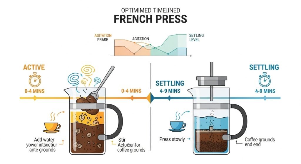 The “James Hoffmann” Technique (4:00 – 9:00): At the 4-minute mark, do not plunge. Instead, stir the crust so the grounds sink. Use two spoons to remove any floating foam or oils. Wait another 5 minutes. During this time, gravity does the work that the plunger usually does—settling the silt at the bottom.