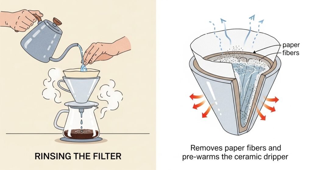 Not all V60 filters are created equal. Some bleached and unbleached papers can impart a “papery” flavor to the brew. To avoid this: